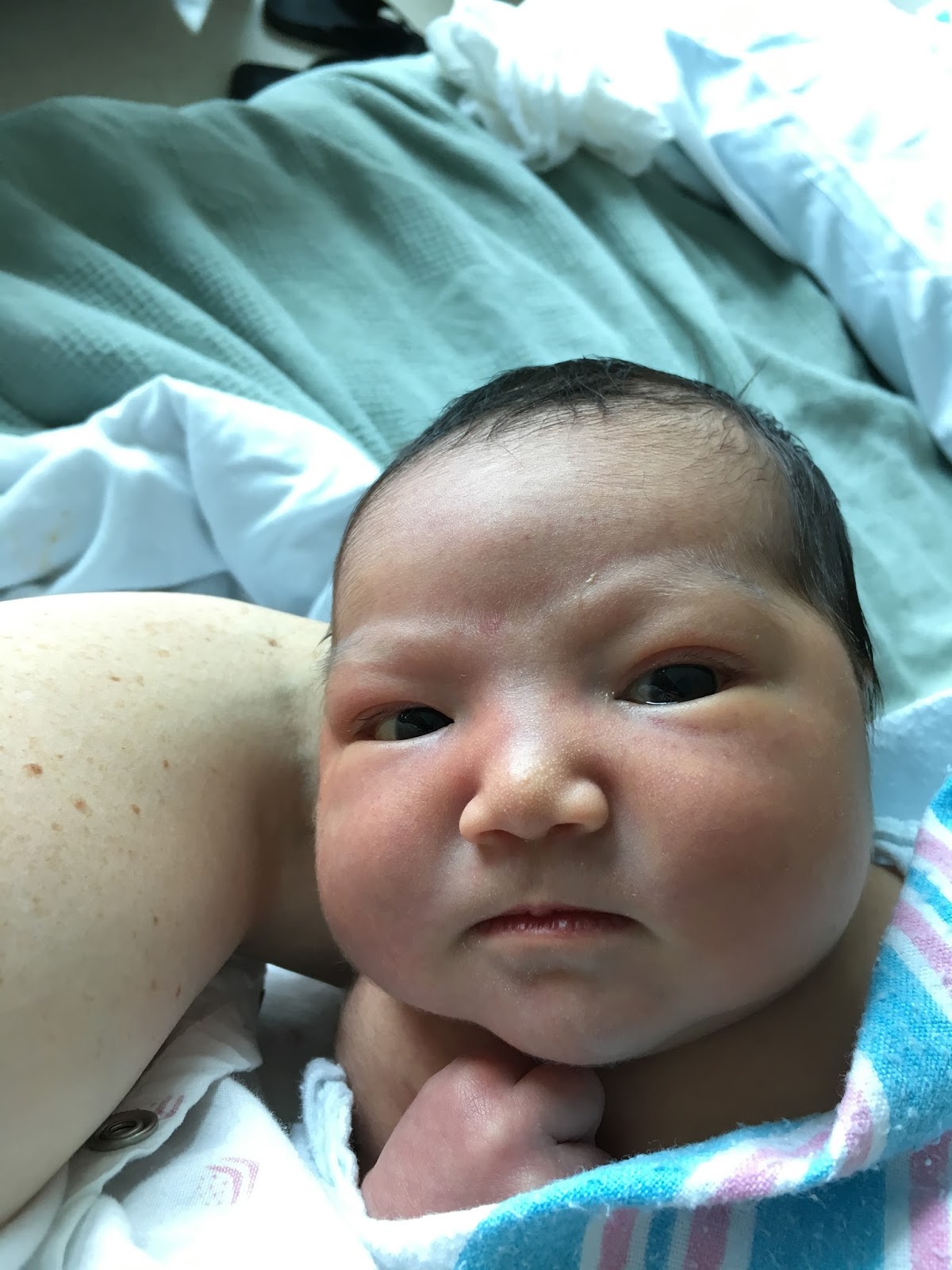 a bit high, so they wanted to let my still incredibly regular and strong contractions do some more work to move her down further before I started pushing. I think my doula had arrived by this point and was helpfully feeding me ice chips and reminding me to keep putting the oxygen mask back on, because by this point Juliette was starting to get a bit agitated, requiring full time oxygen and also only allowing me to be in certain positions (eg, on my left side) or else she'd make alarms go off.
